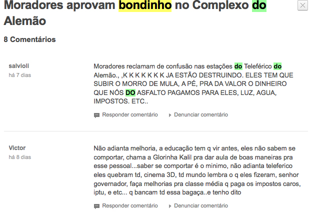 Depois de ler a matéria na revista Wired fui procurar na internet o que a imprensa brasileira dizia a respeito do bondinho. Encontrei um artigo do Extra, um jornal super popular, que me deixou chocada. Não tanto pelo texto do artigo, mas pelo comentário dos leitores. Gente que teve a coragem de dizer: “eles tem que subir o morro de mula, a pé, pra dar valor ao dinheiro que nós do asfalto pagamos para eles, luz, água, impostos, etc”. Nunca li algo tão racista e de gente tão ignorante em toda a vida. Gente que esquece que quem mora em favela também trabalha duro, muitas vezes em troca de uma ninharia, e apesar de trabalhar tanto é totalmente excluído da sociedade. O problema não é quem mora na favela, o problema são as pessoas que desviam o dinheiro público. Quem quiser fazer batalha, que vá contra esse tipo de caso/pessoa.